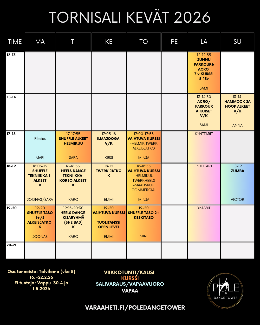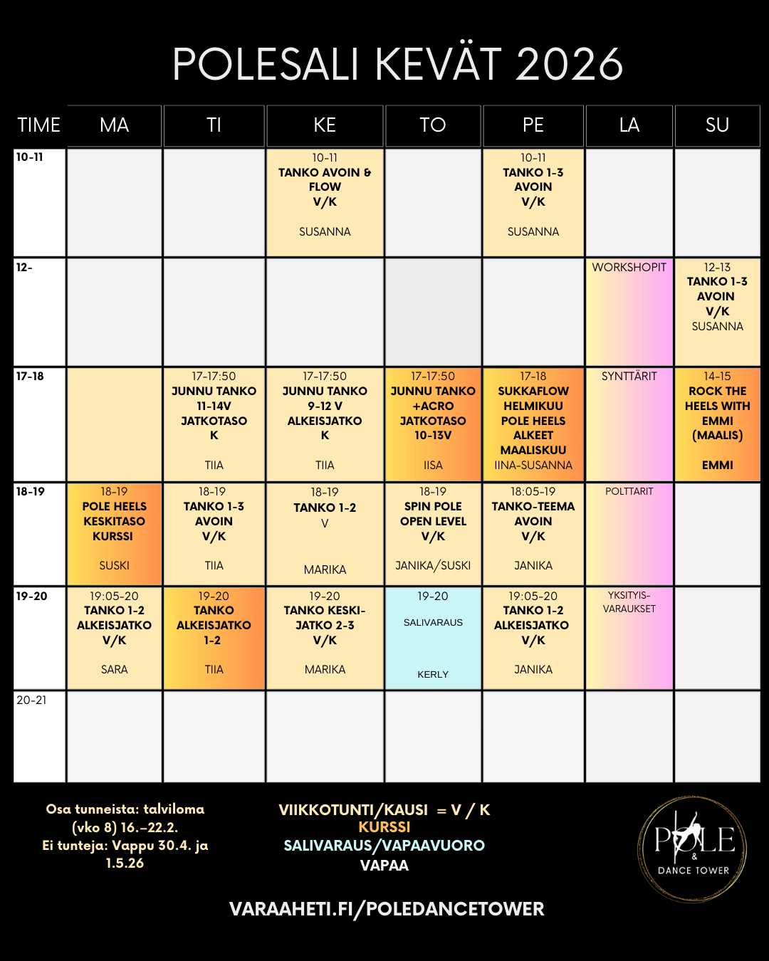 Mikäli sinulla tulee kysyttävää tunneista, varauksista tai maksamisesta, voit joko soittaa, laittaa viestiä tai sähköpostia! puh: 040 543 5342 / susanna@poledancetower.fi