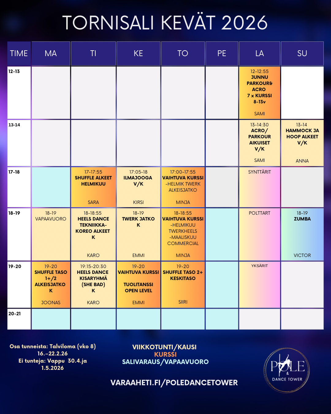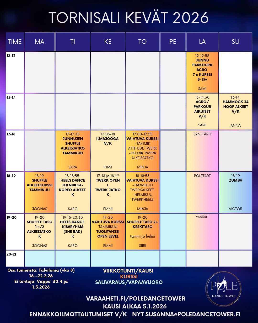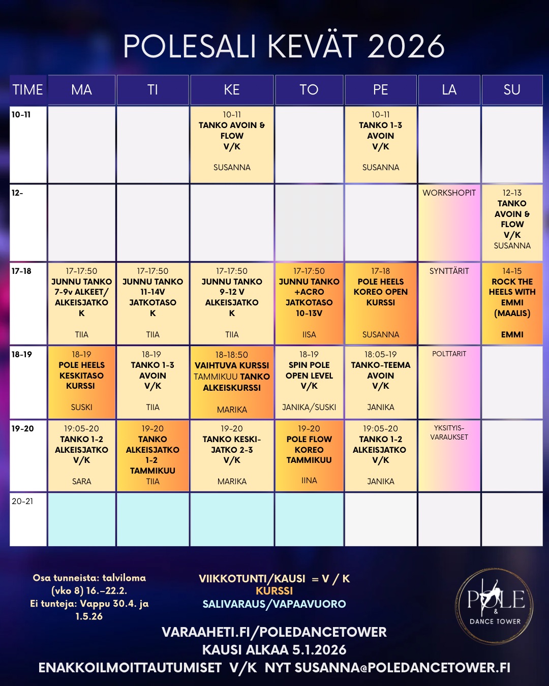 Mikäli sinulla tulee kysyttävää tunneista, varauksista tai maksamisesta, voit joko soittaa, laittaa viestiä tai sähköpostia! puh: 040 543 5342 / susanna@poledancetower.fi