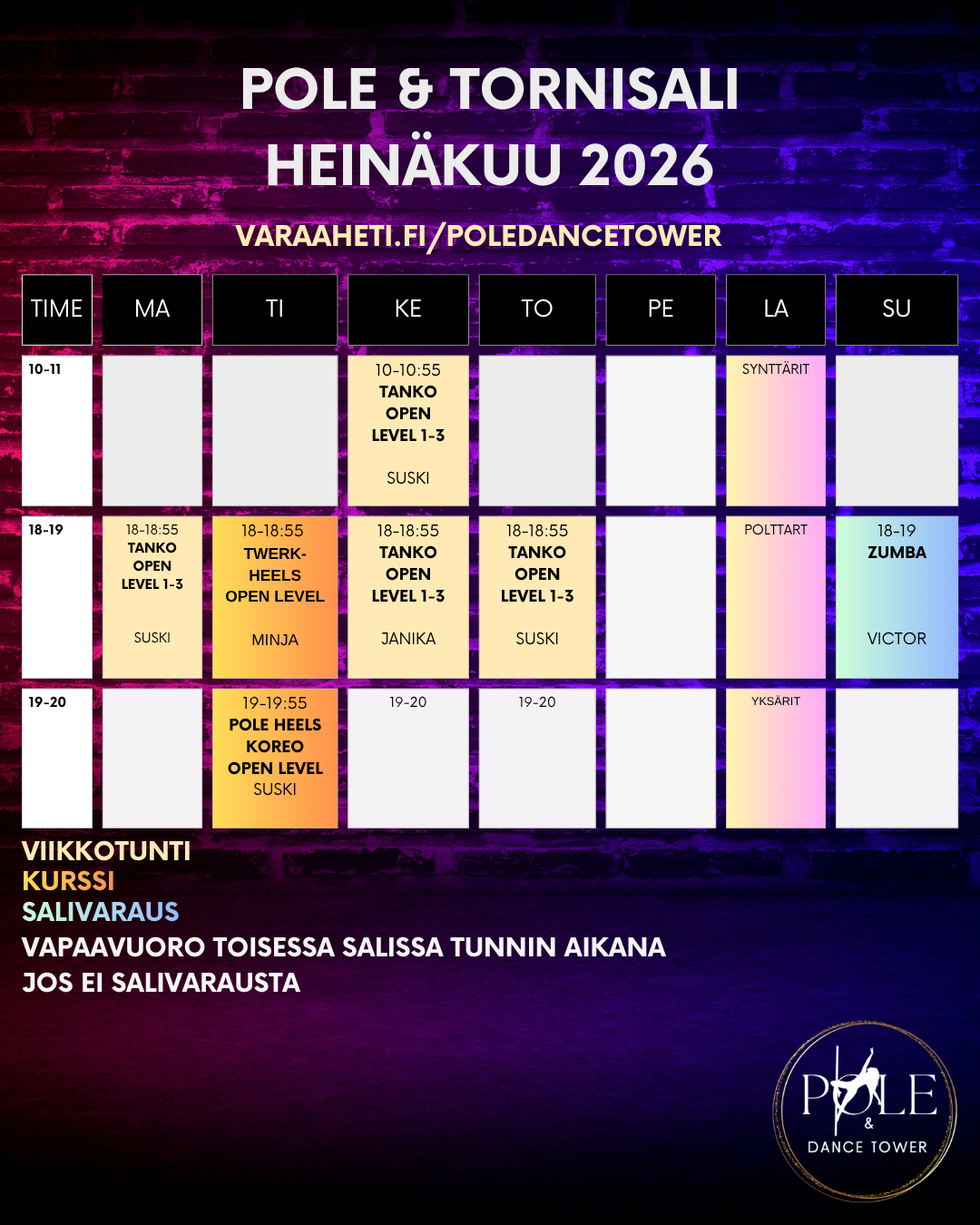 TOWERIN KEVÄTPARTYT - Tilausvahvistus toimii lippuna. Viimevuotiseen tapaan luvassa on upeita esityksiä – ja uutena ohjelmanumerona Towerin tyyliin hauska, kilpailuhenkinen ja viihdyttävä BATTLE! Ja tietysti nyyttärimeininki! t Tuo tarjoilupöytään jotain pientä mukanasi. omat eväät ja juomat myös sallittu ⸻ BATTLE – SÄÄNNÖT • Pareittain 60 sekunnin impro • Parempi jatkaa seuraavalle kierrokselle – paras voittakoon! • Tyyli täysin vapaa • Ainoa sääntö: tankoon pitää koskea vähintään yhden kerran -Tämä battle on tarkoitettu kaikille! Saat heittäytyä ja ennen kaikkea pitää hauskaa. - Halutessasi voit pyytää battlen soittolistan Suskilta, jos haluat kurkkia etukäteen, mitä biisejä käytetään. Pisteytys (asteikko 1–5) Pisteet jaetaan kolmesta osa-alueesta: 1. Energia ja heittäytyminen 2. Musiikin tulkinta ja rytmi 3. Tekniikka (oman lajin mukaisesti, sen mukaan mitä improvisaatiossa nähdään) - Battlen voittajalle on luvassa palkinto! Battle-ilmoittautumiset suoraan Suskille. ⸻ - ESITYKSET Haluatko esiintyä? Ilmoittautumiset Suskille. ⸻ - ILMOITTAUDU PARTYIHIN MUKAAN OSTAMALLA TÄSTÄ LIPPU Osallistumismaksu kaikille 5 € (saadaan kulut katettua). MAKSU OSTON YHTEYDESSÄ MobilePaylla NRO 90066 ⸻ PARTY PARTY!!! AIKATAULU: ovet auki 18:30 aloitus 19:00 lopetus noin klo 22:00 loppusekoilut ja ovet sulkeutuu 23:30